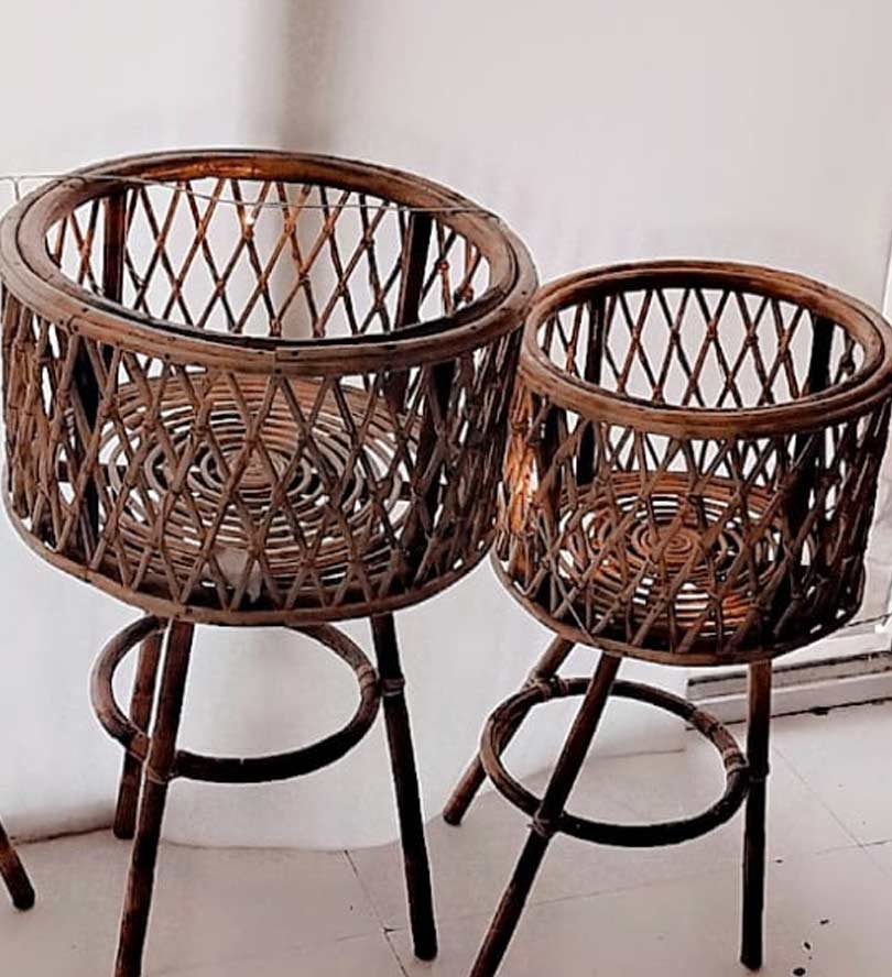 This item is a handcrafted bamboo and rattan piece that typically functions as either a cane plant stand or a baby cradle.